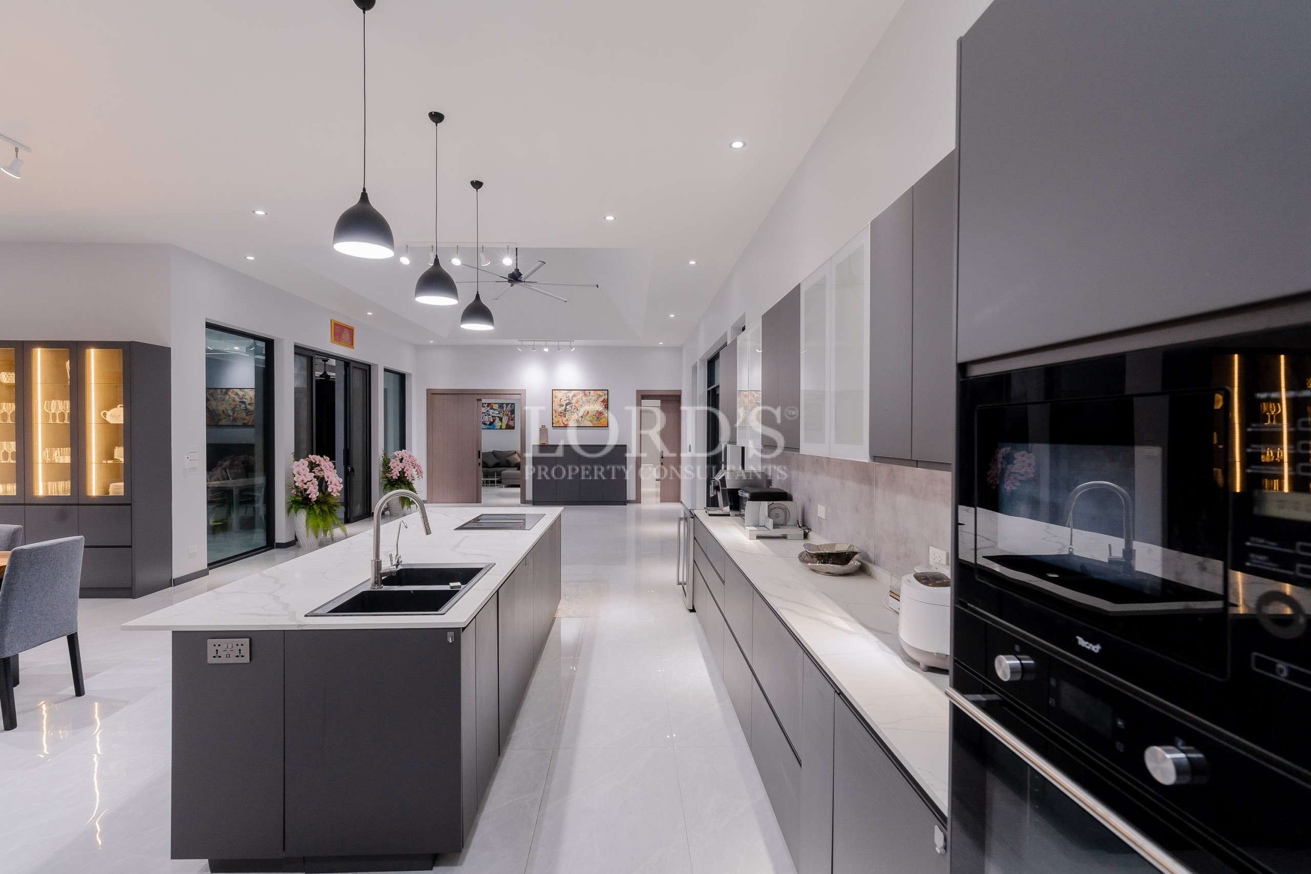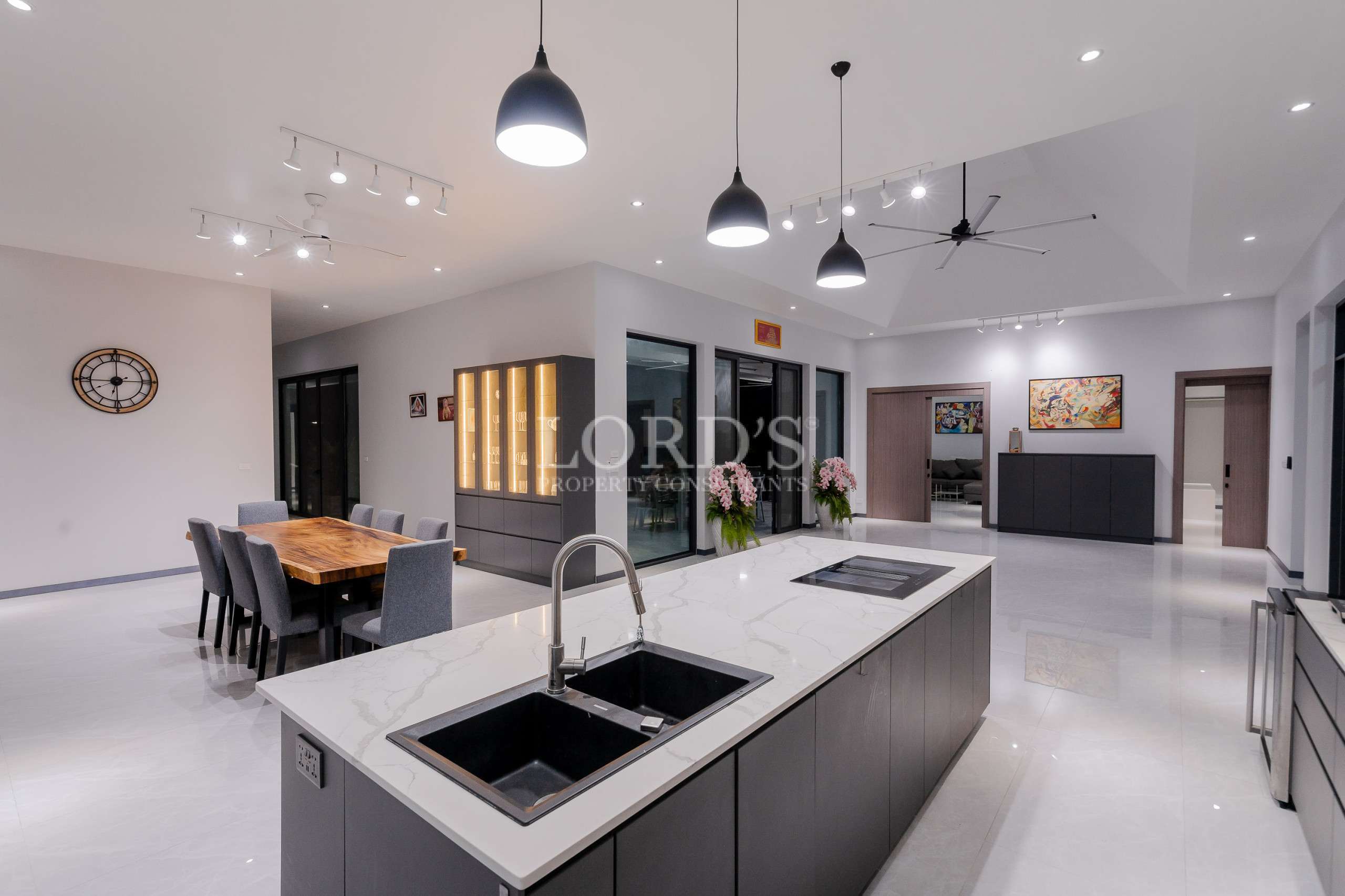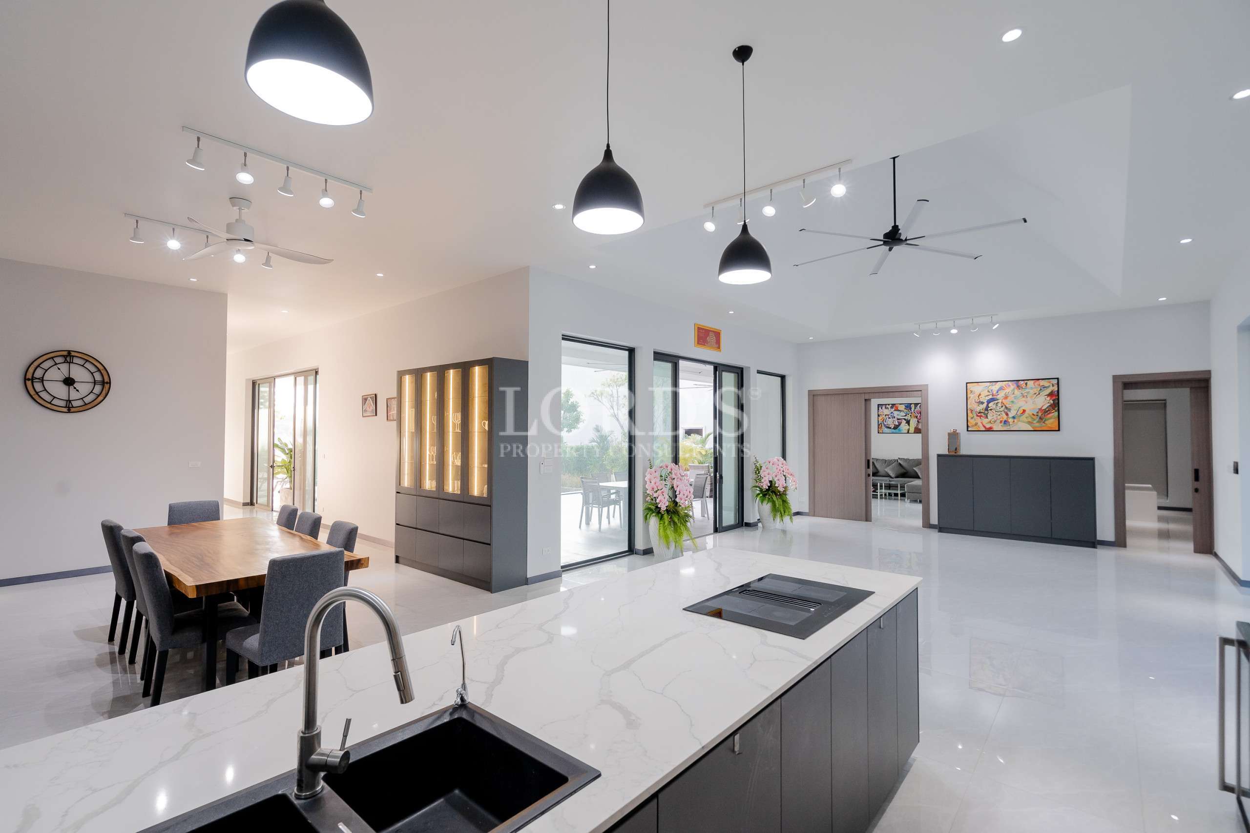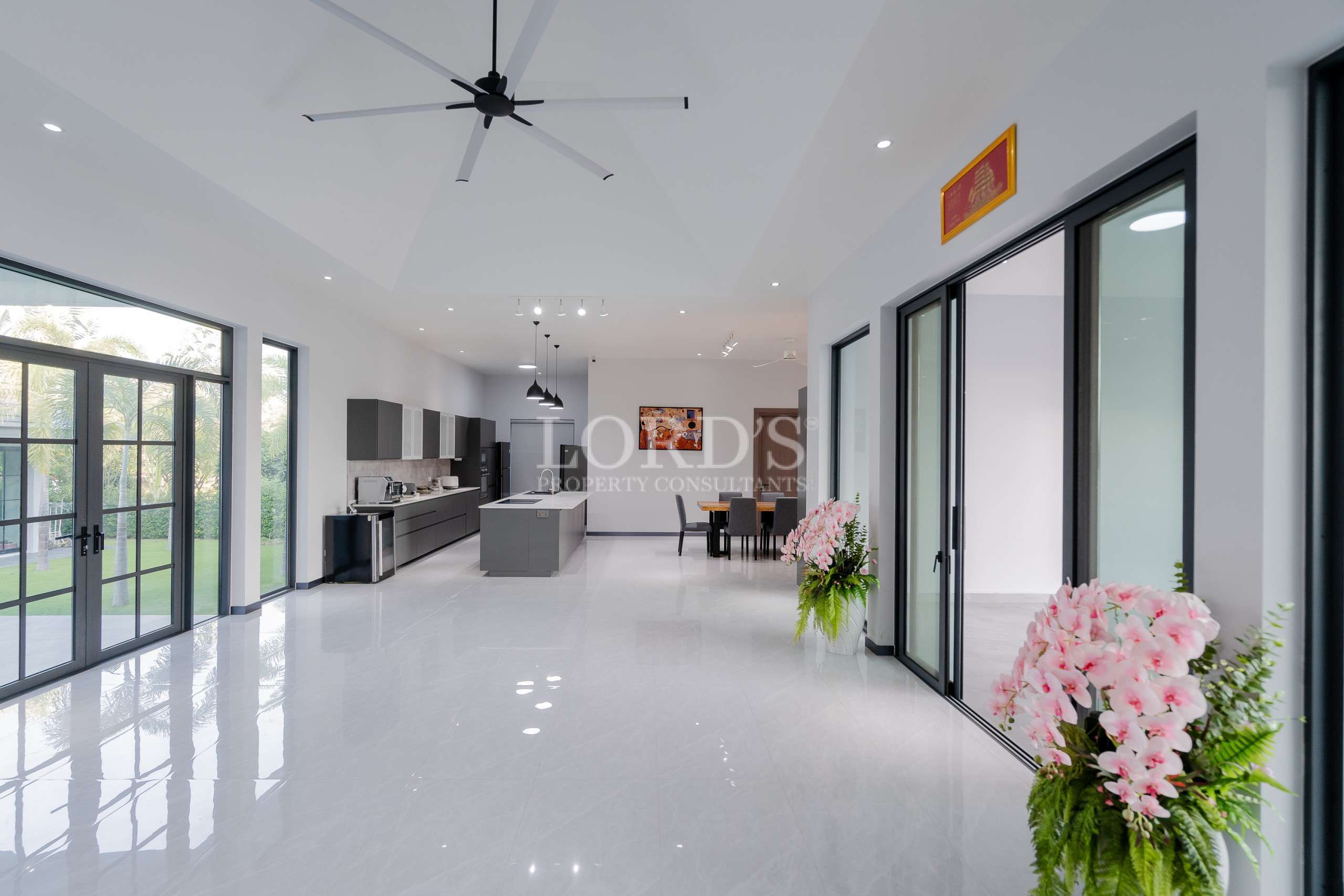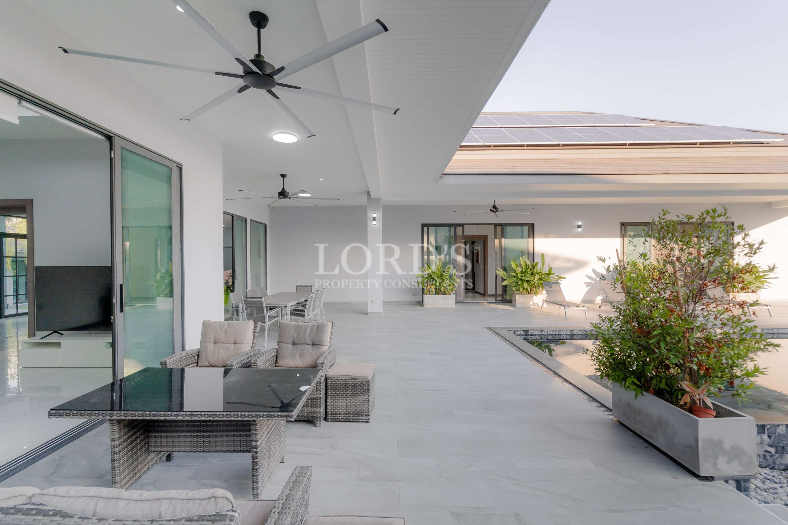 Die Villa besteht aus 5 Schlafzimmern mit eigenem Bad und extra Gästetoilette, einer großen offenen Küche und einem geräumigen Essbereich, außerdem gibt es einen TV/Karaoke-Raum und einen Hauswirtschaftsraum.